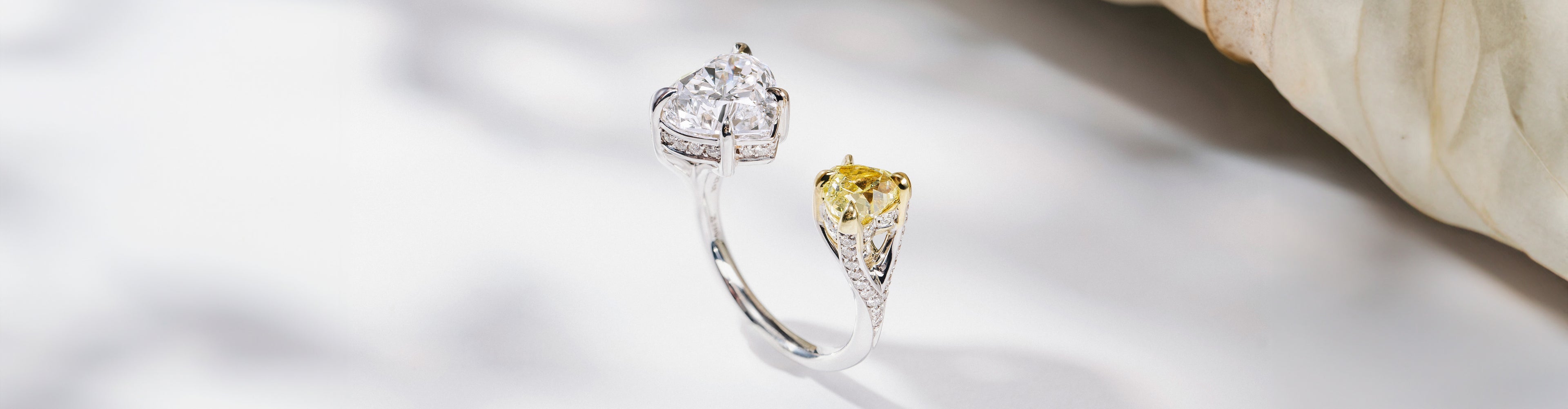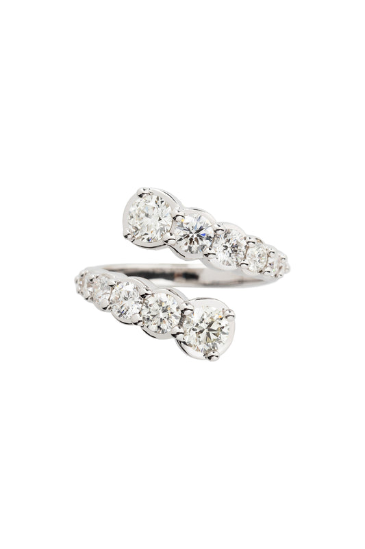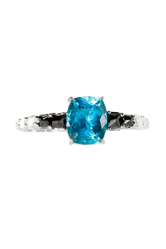 Apatite two-finger ring with black and white diamonds in 18k white gold
