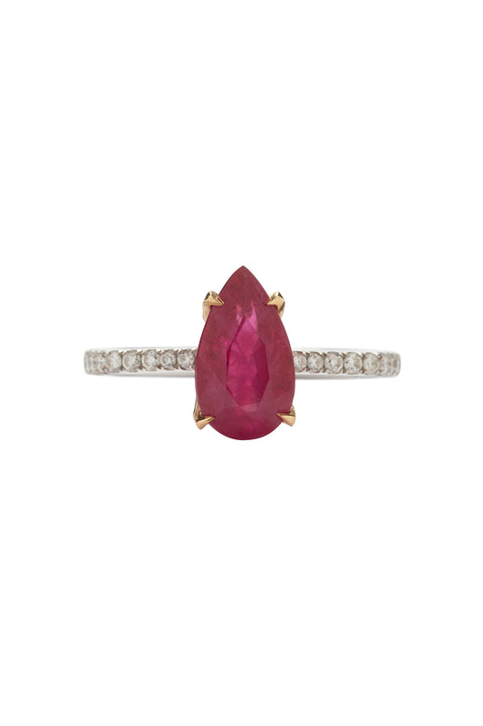 Pigeon Blood ruby ring with white diamonds in 18k white and rose gold