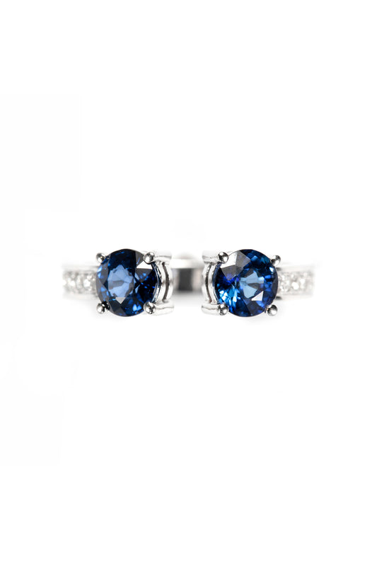 Blue Sapphires ARA X MR DEAN brooch with inverted black diamonds and diamonds in 18k white and yellow.