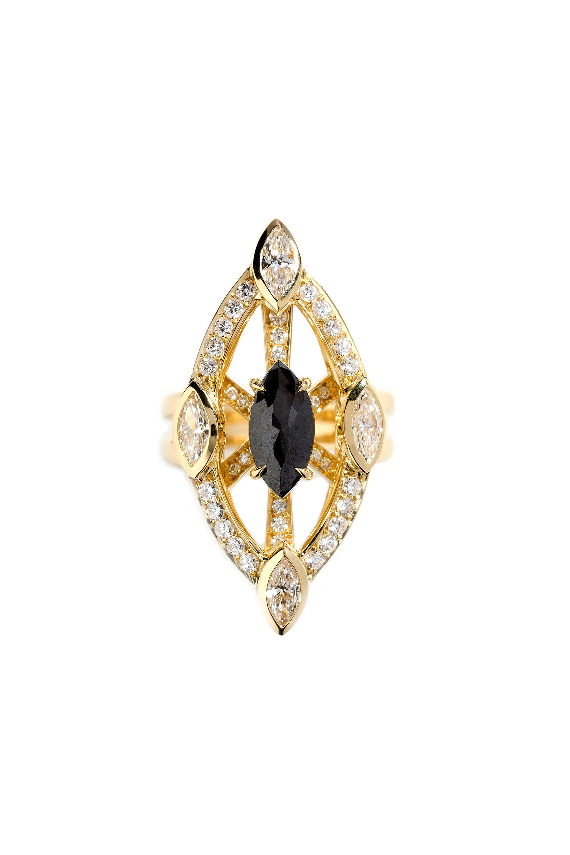 Black diamond ring with white diamonds in 18k yellow gold
